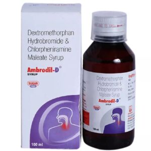 Ambrodil-D Syrup is a combination of two medicines: Chlorpheniramine Maleate and Dextromethorphan Hydrobromide, which relieves dry cough. Chlorpheniramine Maleate is an antiallergic which helps reduce cough associated with allergies by blocking the effects of a chemical messenger, histamine. Dextromethorphan Hydrobromide is a cough suppressant which relieves cough by reducing the activity of cough center in the brain.