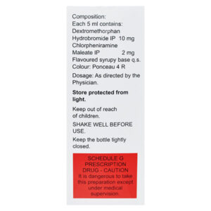 Ambrodil-D Syrup 100 ml is a combination of two drugs, namely: Chlorpheniramine and Dextromethorphan, primarily used to treat dry cough. Chlorpheniramine belongs to the class of antihistamines (anti-allergic drugs) that works by blocking the action of histamine, a substance responsible for causing allergic reactions. It helps to provide relief from symptoms of allergy such as sneezing, running nose, watery eyes, itching, swelling and congestion or stiffness. Dextromethorphan belongs to the class of cough suppressants that works by blocking the transmission of nerve signals from the cough centre in the brain to the muscles that produce cough. Thus, it decreases the need to cough.