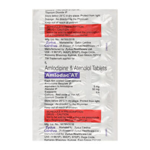 Amlodac AT Tablet 15’s is a combination drug containing ‘anti-hypertensive’ drugs containing Amlodipine (a calcium channel blocker) and Atenolol (a beta-blocker) primarily taken for the treatment of hypertension (high blood pressure). Amlodac AT Tablet 15’s reduces the heart’s workload making the heart more efficient at pumping blood throughout the body and relaxing and widening the blood vessel. Thus, it collectively helps lower high blood pressure, reducing the chances of heart attack or stroke.
