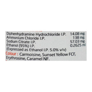 Benadryl Cough Formula Syrup, 150 ml contains Ammonium chloride, Diphenhydramine hydrochloride, Sodium citrate and ethanol used to treat cough. Ammonium chloride is an expectorant that increases the volume of fluid in the airways, reduces the stickiness of mucus and helps to remove it from the airways. Diphenhydramine hydrochloride is an antihistamine (anti-allergic drug) that blocks the action of histamine, a substance responsible for causing allergic reactions. It helps to provide relief from symptoms of allergy such as sneezing, running nose, watery eyes, itching, swelling, and congestion or stiffness. Sodium citrate is a mucolytic agent (cough/sputum thinner) that works by thinning and loosening phlegm (mucus) in the lungs, windpipe and nose. Thereby, it helps to cough out easily. Ethanol acts as a preservative.
