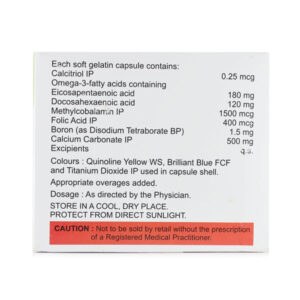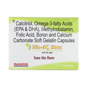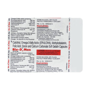 Bio-D3 Max Soft Gelatin Capsule is a combination of B vitamins and minerals. Calcitriol works by helping the body utilize more of the calcium present in ingested foods or supplements and regulating the body’s production of parathyroid hormone. Calcium carbonate works in the blood by preventing or treating negative calcium balance seen in low serum calcium conditions. Calcium is required for healthy muscles, bones, nervous system, and heart. Omega-3 fatty acids may decrease the amount of triglycerides and other fats produced in the liver. Methylcobalamin corrects vitamin B12 deficiency, thereby helping in treating certain anemias and nerve problems. Folic acid is essential for the production of red blood cells. It prevents and treats folate deficiency and anemia. When taken by pregnant women, folic acid prevents miscarriage, preterm labor, and neural tube defects in infants. Boron improves the metabolism of key vitamins and minerals.