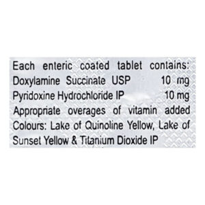 Doxinate Tablet 30’s is a combination of two drugs, namely: Doxylamine and Pyridoxine (vitamin B6) used to treat nausea and vomiting during pregnancy. It prevents the feeling of nausea and sickness in pregnant women. Besides this, it also provides nutrition to the body. Doxylamine belongs to the class of antihistamines that works by blocking the natural chemical (histamine) in the body, thereby preventing nausea and vomiting. Pyridoxine/Vitamin B6 deficiency may cause nausea and vomiting during pregnancy. Pyridoxine works by increasing the level of vitamin B6 in the body and treating nausea and vomiting during pregnancy.
