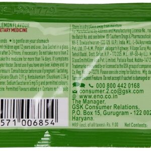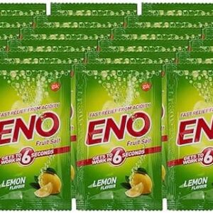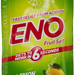 Get fast relief from acidity with ENO that starts working in just 6 seconds. It rapidly works on 6 signs of acidity like sour taste in mouth, burn in throat, chest & stomach, stomach discomfort, and heaviness. It is formulated using a combination of salts in a lemon flavor that provides comfort and relief from acidity quickly.