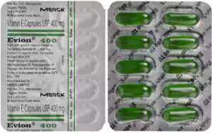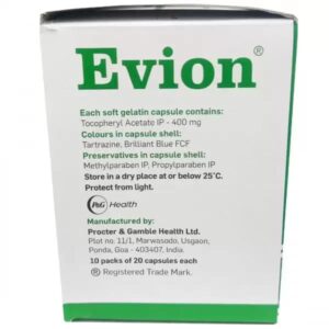 Evion 400 Capsule 20’s contains Tocopheryl acetate (vitamin E), a fat-soluble vitamin that acts as an antioxidant with anti-inflammatory properties. It helps nourish and protect the skin from damage caused by free radicals. It may also decrease your heart disease risk, certain cancers, vision problems, and brain disorders. It is a powerful antioxidant that protects cells from further damage caused by external factors like pollution, harsh weather, and smoking and prevents wrinkle formation. Applying directly to the skin gets easily absorbed into the skin, provides excellent moisture to dry patchy skin areas, and protects the skin from further damage caused by harmful sun rays. It is a natural skin-lightening product that reduces melanin production and, improves skin tone, texture, sensitivity, and reduces skin uneven colour. It also improves wound healing and improves skin and burns by repairing and regenerating the skin’s damaged tissues.