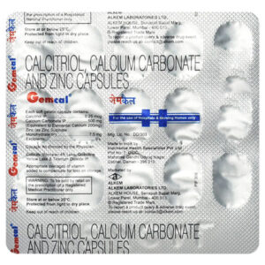 Gemcal Capsule 15’s consists of three medicines, namely: Calcium carbonate (mineral), Calcitriol (Vitamin D3), and Zinc (mineral). Calcium is a mineral that is used to prevent or treat a calcium deficiency. It provides essential nutrients to maintain bone formation and maintenance. Calcitriol is a synthetic version of Vitamin D3 and treats calcium deficiency with hypoparathyroidism (the parathyroid glands’ decreased activity) and metabolic bone diseases in people with chronic kidney failure. It raises Vitamin D levels and thereby increases calcium levels in the blood. This helps in improving the absorption rate of calcium from the intestine. Zinc is a mineral that has an essential role in bone health. Zinc helps to stimulate osteoblastic bone formation and mineralization.